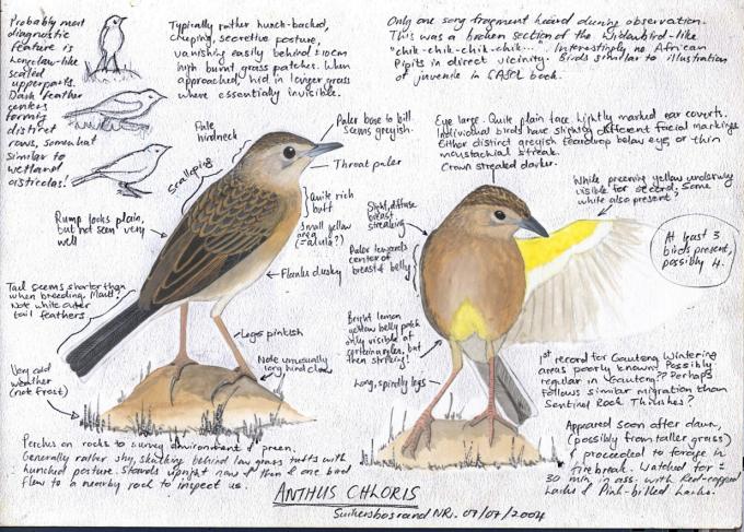 FEATURE ARTICLE: Yellow-breasted Pipit - Notes on Identification of Non-breeding birds (And a lesson in note-taking)In July of 2004 I went out birding with Faansie Peacock - the main object being to confirm the presence of non-breeding Yellow-breasted Pipits at Suikerbosrand Nature Reserve. To cut a long story short, we found the birds, as described here. The Identification of these drab LBJ's (in winter plumage anyway) is no simple matter. A day later, Faansie said he had made some notes on the birds, and would I care to comment? I did not know at the time that Faansie was working on a book on Pipits, but was naturally very impressed at the detail and artistic skill displayed in his "notes". These are certainly a lesson to most of us birders, who are generally not avid note-takers to say the least! Faansie's work on the Pipits of Southern Africa is still available. The book is highly recommended! Get yourself a copy before it is out of print! Visit pipits.co.za to order a copy! Etienne Marais PS: Click on the image for a full-scale version (276KB)
