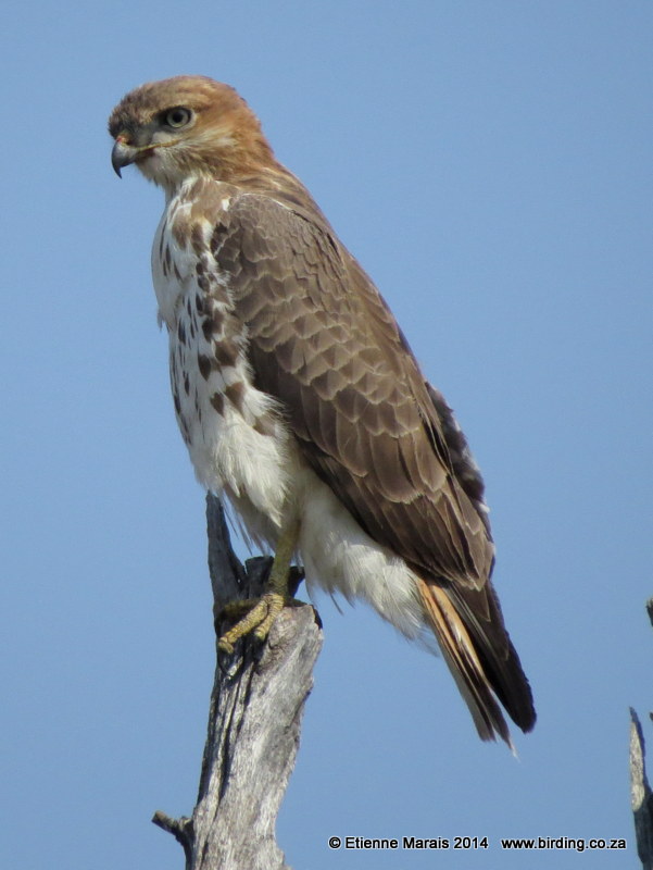 In this photo, the stocky feet and rufous tail with broad, dark sub-terminal bar is visible - as are the well-defined dark blotches on the sides of the breast. © Etienne Marais 2014 |