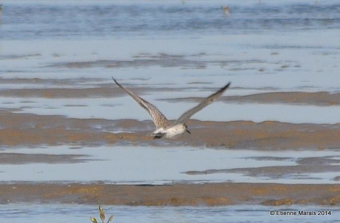 Great Knot recorded again in Mozambique.One of the big rewards of visiting the Inhambane estuary is the vast numbers of shorebirds present. The sheer size and innaccessibility of most of the estuary makes it very hard to cover all the possibilities, but on out trip in April/May we worked hard to scan the waders in search of something different.After some hard work, we located a single Great Knot on the estuary side of the Barra Peninsula near Inhambane on the 28th of April, 2014. Before more comphrehensive analsysis of the bird in question could be undertaken, it took off and flew into the long-off distance - as waders tend to do in this vast area. We waited again in the same area on the next day (30 April) and as if on cue, the bird was located feeding in the same area again. We were able to get confirmation and also some images of the bird, which was actually much more co-operative the second day round. Initially the bird was picked up due to it's unique GISS - clearly larger than most of the smaller waders about. It had quite an elongated build with relatively long bill. On first sighting it was only just within range to see that it had bold markings on the chest, but nothing like some of the other Great Knot images one finds on the Internet. Frustratingly, it flew off across the vast estuary - only showing a very whitish rump/uppertail coverts.